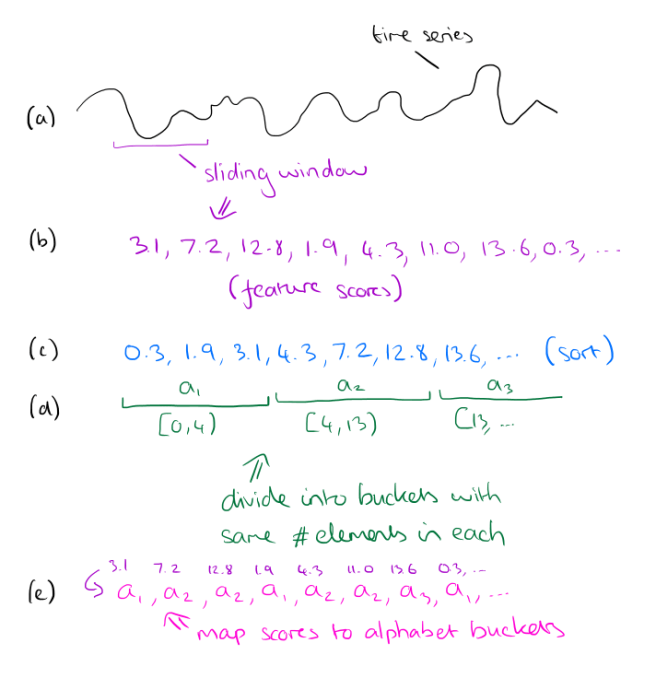 - First turn the input time series X into a discretized time series over some fixed size set of tokens a (the alphabet). (This will later allow us to compute the probability of an occurrence, avoiding the paradox that the probability of a particular real number being chosen from any distribution is zero).