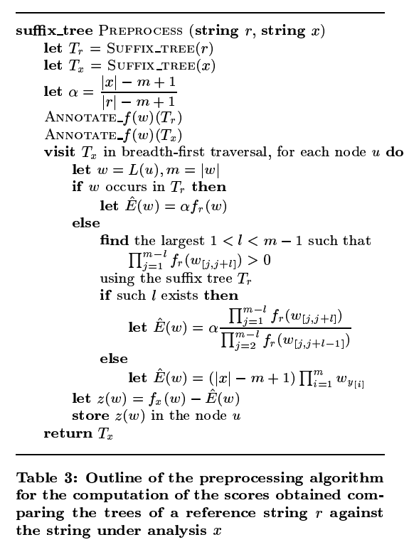 The frequency counts needed to estimate these probabilities are handily encoded in the suffix trees. Now we are ready to estimate the likelihood of seeing the strings that we see in X, as compared to the reference series R.