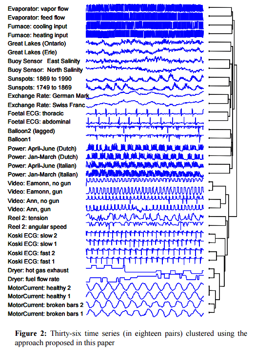 Keogh et al. tested CDM against every time series distance/dissimilarity/similarity measured that has appeared in the last decade in any of the following conferences: SIGKDD, SIGMOD, ICDM, ICDE, VLDB, ICML, SSDB, PKDD, and PAKDD – 51 in total! In addition they also considered Euclidean distance, Dynamic Time Warping, L1, Linf, and the Longest Commons Subsequence (LCSS). The test was done with the URC time series archive for datasets that come in pairs. A top score in this test would correctly cluster all 18 pairs in the dataset with a single bifurcation separating each pair, which CDM does. More than 3/4 of the other approaches tested did not get any of the pairs correct, the next best approaches (DTW, LCSS, HMM with SAX ) got only 1/3 correct.