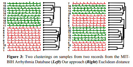 In a comparison of ECG samples, CDM again provided a much better clustering than the next-best method (Euclidean distance in this case).