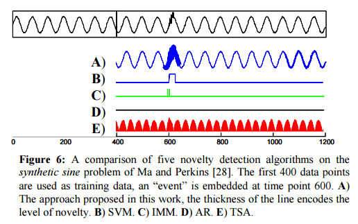 In the ‘noisy sine’ test CDM easily finds the anomaly (thick line, row A). SVM (row B) finds it with careful parameter tuning, and IMM, which is stochastic, finds it in most runs. CDM is orders of magnitude faster though, and does not require setting any parameters.