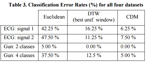 CDM was compared against Dynamic Time Warping (DTW) and Euclidean Distance on ECG datasets (four patients), and on a video dataset of actors performing various actions with guns (2 actors, both with and without guns). There are two ECG signal series, and the task is to classify points by patient from a time series with instances extracted from all four patients. In the gun data set there is a two-class classification problem to identify actor A vs actor B, and a four-class classification problem identifying A-with-gun, A-without-gun, B-with-gun, and B-without-gun.