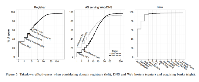 Anti-spam interventions should be evaluated based on their overhead to implement, and their business impact on the spam value chain. Figure 5 shows the effectiveness of takedowns at three different points in the value chain: registrars, web hosters, and acquiring banks:
