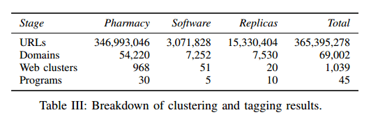 The authors crawled and studied nearly 1 billion spam URLs, and clustered the results by type, homing in on pharmacy, software, and replicas as the three major areas. Table III below shows the number of URLs in each category, and the number of domains, web clusters, and affiliate programs that sit behind them.