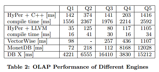 The LLVM code generation technique was implemented in a database system called HyPer, and compared to HyPer with C++ code generation, the VectorWise and MonetDB systems, and a commercial DBMS identified only as ‘X’. DB ‘X’ is a general purpose disk-based system.