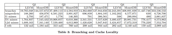 The authors also examined the efficiency of the generated code with respect to branching and caching. Using the callgrind tool of valgrind they were able to limit profiling just to query processing itself and obtained the following results for the five queries in the workload:
