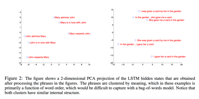 A PCA projection of the LSTM hidden states shows that phrases are indeed clustered by meaning: