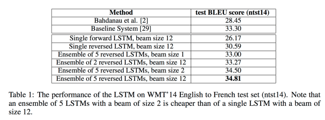 The main result of this work is the following. On the WMT’14 English to French translation task, we obtained a BLEU score of 34.81 by directly extracting translations from an ensemble of 5 deep LSTMs (with 384M parameters and 8,000 dimensional state each) using a simple left-to-right beam-search decoder. This is by far the best result achieved by direct translation with large neural networks. For comparison, the BLEU score of an SMT (Statistical Machine Translation) baseline on this dataset is 33.30. The 34.81 BLEU score was achieved by an LSTM with a vocabulary of 80k words, so the score was penalized whenever the reference translation contained a word not covered by these 80k. This result shows that a relatively unoptimized small-vocabulary neural network architecture which has much room for improvement outperforms a phrase-based SMT system.