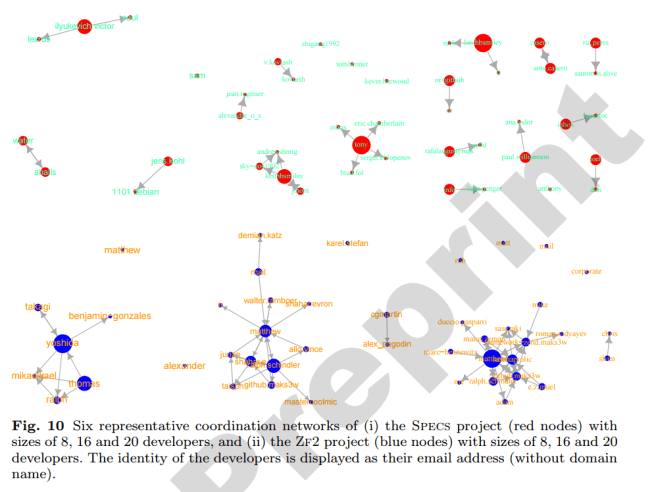 Looking at the networks for these two projects, you can clearly see that SPECS (red) has very little shared editing (coordination), whereas ZF2 (blue) has a much more strongly connected graph. This fits the hypothesis that coordination costs are responsible for much of the productivity drop.