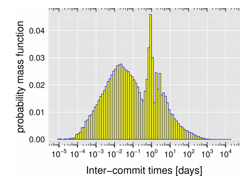 There are peaks at approximately once every 30 minutes, and once a day. (My guess – these correspond to ‘commit early, commit often’ working practices, and ‘end of working day’ commits).
