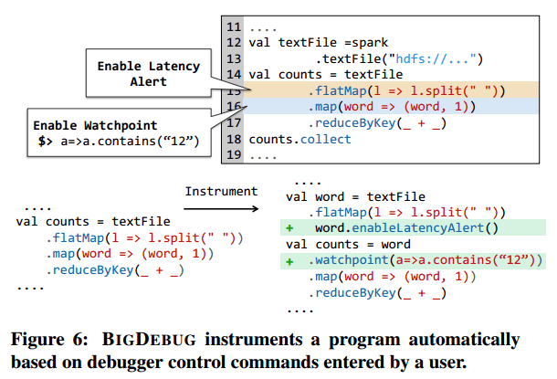Breakpoints, watchpoints, and latency alerts are all implemented as instrumented Spark programs under the covers, which make calls to the BigDebug API.