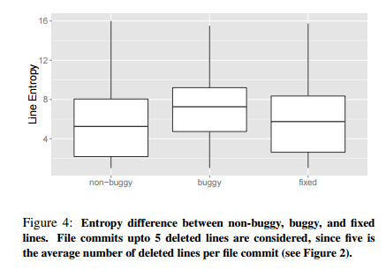 Furthermore, as also illustrated in the above figure, when comparing fixed lines (lines added in bug fixes) to the buggy lines they replace, we again see that their average entropy is lower. This comparison is actually done between ‘hunks’ of code since it can be hard to establish a one-to-one correspondence between a buggy line and a fixed line, as often a buggy line may be fixed by a number of new lines.