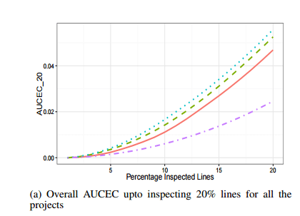 To find out whether unnatural lines are helpful in directing attention in code reviews, the authors computed an AUCEC (Area Under the Cost-Effectiveness Curve) metric assuming that the cost is the inspection effort, and the payoff is the count of bugs found. Overall this shows that entropy is a much better way of choosing lines for inspection than random selection of lines (though of course no-one ever actually selects lines at random for a code inspection do they???). Thus it can be a good guide when indicating parts of the code that are worth looking at more closely. The chart below compares the best performing NBF approach (turquoise / dotted line) with random line selection (purple / dash-dot line).