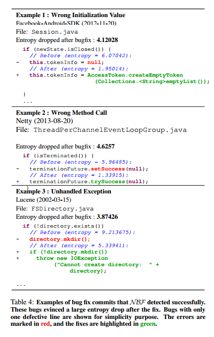 In example 5, it just happens that the reference to logger is newly introduced in the corpus. Nevertheless, overall the entropy of buggy lines drops after bug fixes with statistical significance.