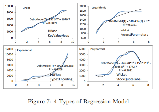 For every real debt identified using this process the authors attempt to fit four different types of regression model: linear, logarithmic, exponential, and polynomial.