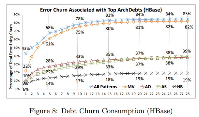 After studying seven Apache open source projects (Camel, Cassandra, CXF, Hadoop, HBase, PDFBox, and Wicket) and finding between 74 and 204 instance of architectural debt in each project, the authors found that from 51%-85% of the maintenance effort in these projects is consumed by paying interest on those debts. As we also saw last week, non-trivial portions (20-61%) of the maintenance effort is consumed by just five architectural debts in each project.