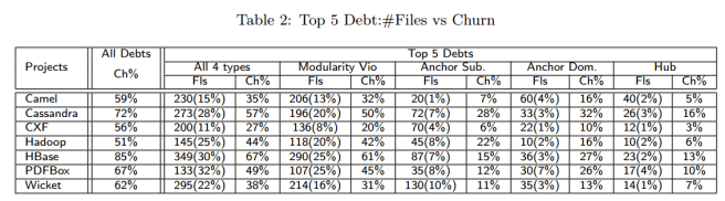 - Modularity Violation debt is the most common and expensive debt – combined it accounts for 82% of the total effort in HBase. “We made consistent observations from all 7 projects, as summarized in Table 2 [below].”