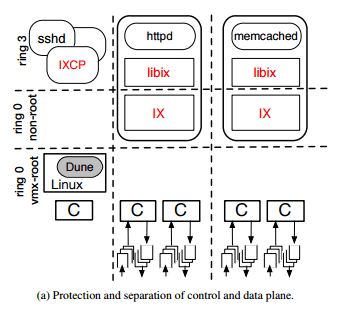 The control plane is responsible for resource configuration, provisioning, scheduling, and monitoring. The data plane runs the networking stack and application logic. A data plane is allocated a dedicated core, large memory pages, and dedicated NIC queues. Each IX dataplane supports a single multithreaded application, operating as a single address-space OS.