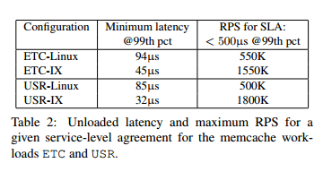 Finally the team test two memcached workloads and report averaged and 99th percentile latency at different throughputs. The Linux baseline setup was carefully tuned so that 99th percentile latency did not exceed 200-500µs following established practices. The ETC workload represents the highest capacity deployment in Facebook, and the USR workload is the deployment with the most GET requests (99%).