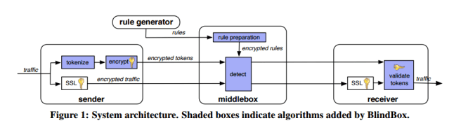 The middlebox must be able to do its job, and the endpoints must not gain knowledge of the ruleset (this is the proprietary IP of the the IDS vendor). Moreover, the middlebox must not be able to learn private data from the traffic and violate the privacy of the endpoints. It has to know something of course – whether or not the traffic matches its rules – and to enable this BlindBox introduces two privacy models, exact match privacy and probable cause privacy.