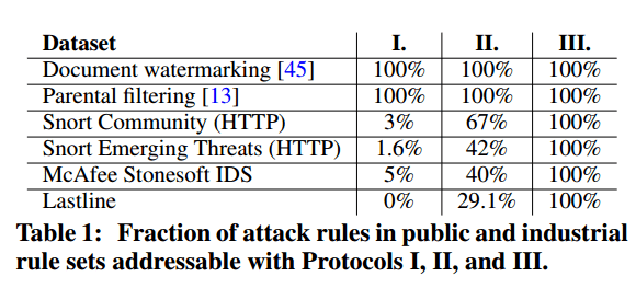 Table 1 below shows the fraction of attack rules addressable with Protocols I (single keyword), II (multiple keywords), and III (probable cause) respectively: