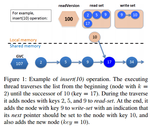 When a transaction begins, the current value of the global clock is saved as the transaction’s read version. The transaction also maintains a read set and a write set. For an operation on some key k, we scan the list from the root traversing every node until we reach the node with a key ≥ k. Every node we traverse on the way is checked to ensure it is either (a) in our write set, or (b) unlocked and at a version ≤ the read version. If these checks pass it is added to the read set (and if not, the transaction aborts). Updates are tracked in the write set (the list itself is not altered until a commit). When commiting the thread first tries to lock all the nodes in the write set, and then validates the read set. If everything looks good the GVC is incremented, the version of all nodes in the write set is updated to the new GVC value and the write set changes are incorporated in the list.