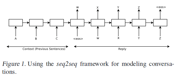 Concretely, suppose we observe a conversation with two turns: the first person utters “ABC”, and the second person replies “WXYZ”. We can use a recurrent neural network and train to map “ABC” to “WXYZ” as show in Figure 1 [below]. The hidden state of the model when it receives the end of sequence symbol can be viewed as the thought vector because it stores the information of the sentence, or thought, “ABC”.