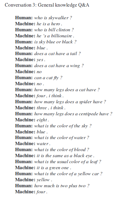What happens if you build a bot that is trained on conversational data, and only conversational data: no programmed understanding of the domain at all, just lots and lots of sample conversations…? Building on the sequence to sequence technique that we looked at previously, this is exactly what Vinyals & Le set out to find out.