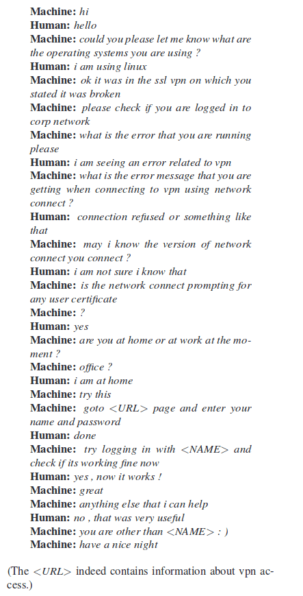 The traditional approach to building bots requires a ‘rather complicated pipeline’ of many stages. In contrast, the neural conversational model is a end-to-end approach to the problem which lacks any domain knowledge. The surprising thing, is just how well it works. We’ll see some example conversations soon. Of course the bot has no understanding of what the conversation means. Or maybe it does have some kind of understanding (just like a word vector seems to capture some understanding of the meaning of a word), but it’s not an understanding we can tap into. Therefore you can’t use this approach to incorporate external knowledge in replies, or to extract intent and take actions etc.. Even so, a bot trained on an IT helpdesk troubleshooting dataset is able to genuinely help people.