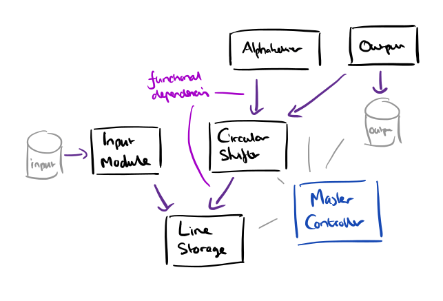 – Considering the example of changing the Line Storage module, you can make the modules even further decoupled. Simply have some sort of Line Storage interface/protocol that can be implemented by multiple modules, allowing the Master Controller to select the appropriate implementation at runtime (i.e. Dependency Inversion + Dependency Injection).