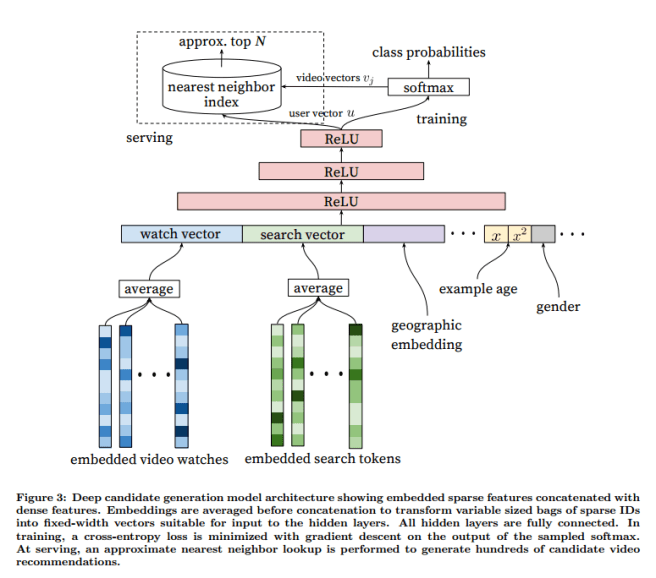 Candidate generation is inspired by continuous bag of words language models used in word vectors. A high dimensional embedding is learned for each video, and these are fed into a feed-forward neural network. The input vector combines a user’s watch history, search history, demographic and geographic features.