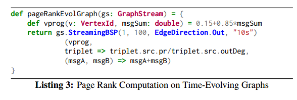 This [streamingBSP] operator enables efficient implementation of a large class of incremental algorithms on time-evolving graphs. We signal the availability of the new graph snapshot using a variable in the driver program. In each iteration of Pregel, we check whether a new graph is available. If so, we do not proceed to the next iteration on the current graph. Instead, we resume computation on the new graph reusing the result, where only vertices in the new active set continue message passing. The new active set is a function of the old active set and the changes between the new graph and the old graph. For a large class of algorithms (e.g. incremental PageRank), the new active set includes vertices from the old set, any new vertices, and vertices with edge additions and deletions.