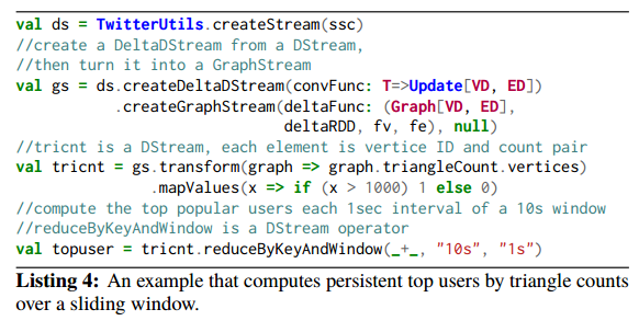 This example computes top users in terms of triangle counts from a Twitter attention graph. A DStream ds is created from the external Twitter feed, and then a GraphStream is built from it. Triangle count is applied to each graph snapshot, and then we compute the number of times a user is a top user over a sliding window of ten seconds, outputting results every second.