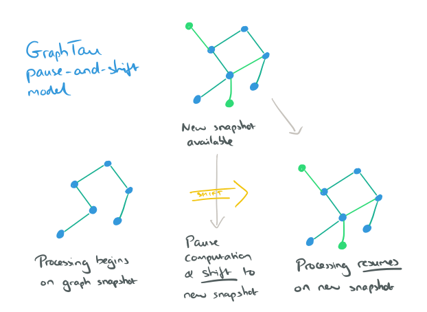 In this model, GraphTau starts running a graph algorithm as soon as the first snapshot of a graph is available. Upon the availability of a new snapshot, it pauses the computation on the current graph, shifts the algorithm specific data to the new snapshot, and resumes the computation on the new graph.