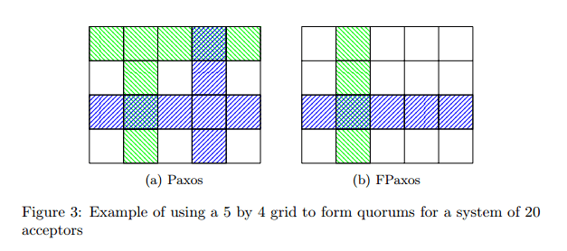 Howard et al. go on to illustrate the practical implications of the relaxed quorum requirement for FPaxos using majority quorums, simple quorums, and grid quorums. These however can be considered “naive” quorum systems, and FPaxos actually opens up a whole new world:
