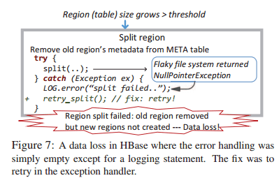 - Error handlers that ignore errors (or just contain a log statement). This example led to data loss in HBase:
