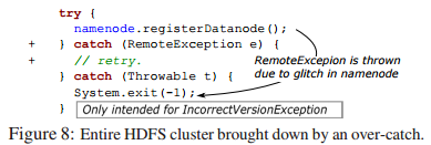 - Error handlers that catch an abstract exception type (e.g. Exception or Throwable in Java) and then take drastic action such as aborting the system. This example brought down a whole HDFS cluster:
