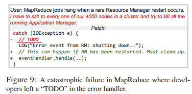 - Error handlers with “TODO” or “FIXME” in the comment. This example took down a 4000-node production cluster: