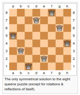 - Reduce the number of candidate solutions that must be generated and tried, using a little domain knowledge: in this case, that there must be one queen in every column. This process would find an answer in about 100 seconds on the technology of the day.