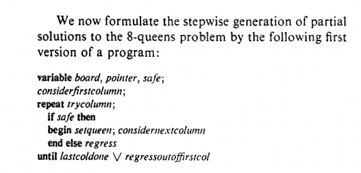 By far the bulk of the paper though, is dedicated to one worked example of this principle, introducing the idea of stepwise refinement. The goal is to write a program to solve the eight-queens problem.