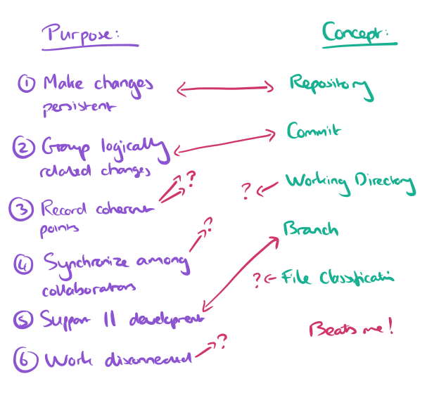 As we saw yesterday, Gitless has a smaller number of concepts. I really wish the authors had provided the new purpose -> concept mapping for Gitless, but as it is we’re going to have to try to recover that for ourselves. The purposes remain unchanged of course. The concepts in Gitless are: