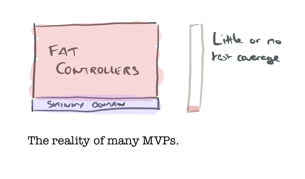 You built your MVP rapidly. The point was to learn and iterate quickly. It may look polished (for what it does) on the surface, but underneath it’s more like a sketch of what the system ultimately might be. I’ll use the example of a webapp (for example, supporting a SaaS product) but it could be any kind of codebase really. In such a codebase I would typically expect to see ‘fat’ controllers with methods that look like transaction scripts, and a very skinny domain model underneath if any. It’s probably not very dry (small bits of logic repeated across controller methods). In terms of levels it’s pretty flat, you might see things like bare outbound HTTP requests directly from controller methods. You have minimal if any tests, testing up to this point has mostly consisted of loading the site in your browser, clicking around and verifying that things seem to be working.