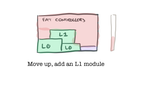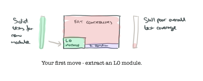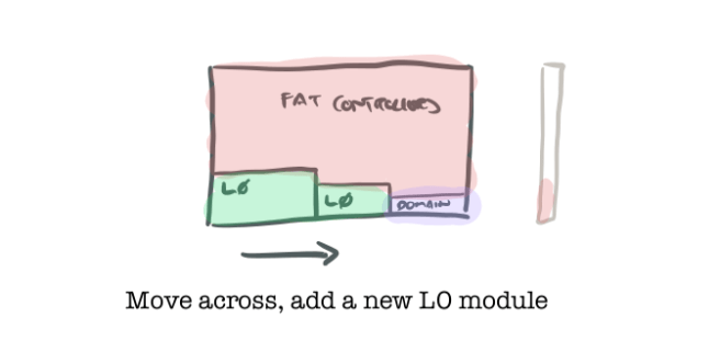 - Refactor the rest of the code base to sit on top of this new module as appropriate. If you’ve got fat transaction-script controllers, this probably means some small parts of the logic in some of them moves out and becomes calls to your new module.