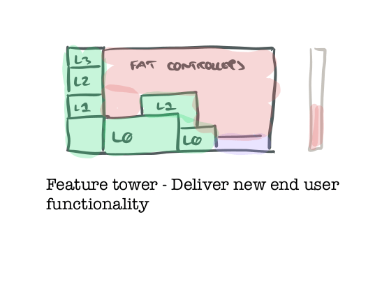 - Another move you can make might best be described as a ‘feature tower.’ As I said up-front, you’ll be lucky if all externally visible progress on your app/service can grind to a halt while you rework the system internals. One way to address this is to work on slim vertical slices of new functionality, top-to-bottom (or really I should say bottom-to-top). Here you build just enough robust, properly tested, functionality at each level in the stack, working from the bottom-up, to support a new feature area, adding it alongside the existing functionality.