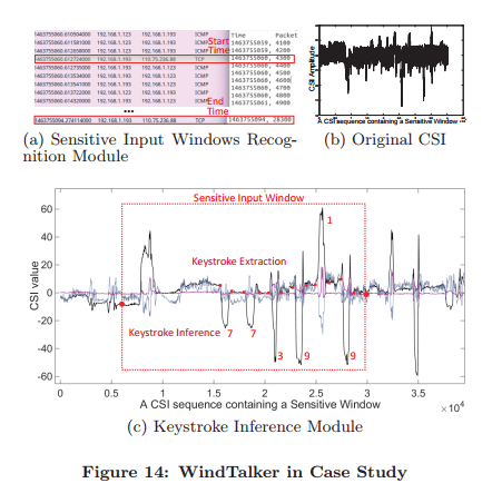 To determine the sensitive input windows, WindTalker runs in a real-time fashion to collect the meta data (e.g., IP address) of the targeted sensitive mobile payment applications (e.g., Alipay). For example, in the experiment, Alipay applications will always route their data to the server of some specific IP address such as “110.75.xx.xx”. This IP address will be kept to be relatively stable for one or two weeks. With the traffic meta data, WindTalker obtains the rough start time and end point of the Sensitive Input Window via searching packets whose destination is “110.75.xx.xx”. Then WindTalker begins to analyze the corresponding CSI data in that period of time…