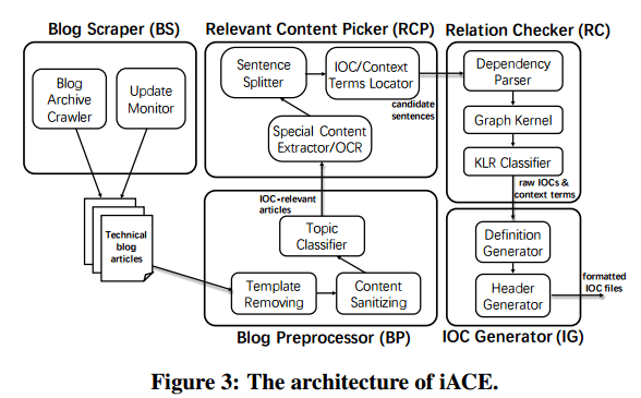 There are five main components in iACE: a blog scraper; blog preprocessor; relevant content picker; relation checker; and finally the IOC generator. One of the things I like is that at each step, by mostly taking advantage of prior art and existing libraries and integrating them cleverly, they are able to build towards a powerful and novel solution. It’s a great example of what’s possible with modern system building when you have awareness of some of the building blocks out there (or a willingness and inclination to go and search for them!).