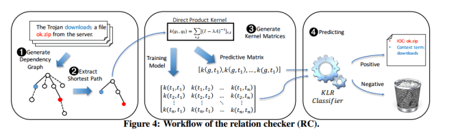 Based on our customized direct-product kernel, we run a classifier (the relation checker) to determine the presence of IOC relations between a context term and an IOC candidate within a sentence. The classifier is trained over DS-Labeled with 1500 positive instances and 3000 negative instances