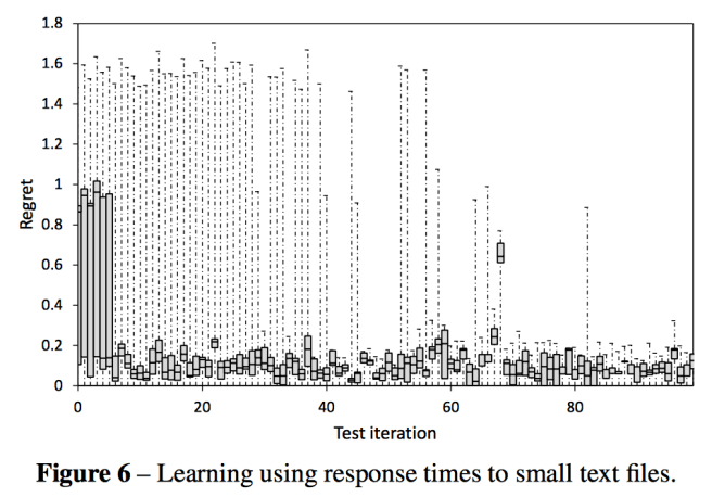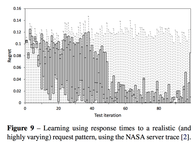 In Fig. 9 (below) we show results from a real-world web server workload of highly mixed resource requests, taken from the publicly available NASA server trace [2]. This is a challenging request pattern due to its high variance over time, in which different kinds of resource are requested in very different volumes. As a result our learning approach finds it more difficult to compare like-for-like results as different configurations are tested. Initially regret here is generally high, but decreases steadily up to the 40th iteration mark.