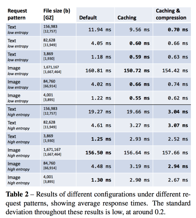 The evaluation shows that the component combinations which give the best performance at any point in time depend very much on the workload characteristics. For example, the type of resources most commonly requested (text or image), the size of the returned documents, and how diverse a set of documents are requested (‘entropy’ in the table below):