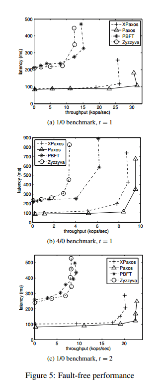 XPaxos was compared against the PBFT and Zyzzyva BFT protocols, and a WAN-optimized variation of crash-tolerant Paxos (CFT).
